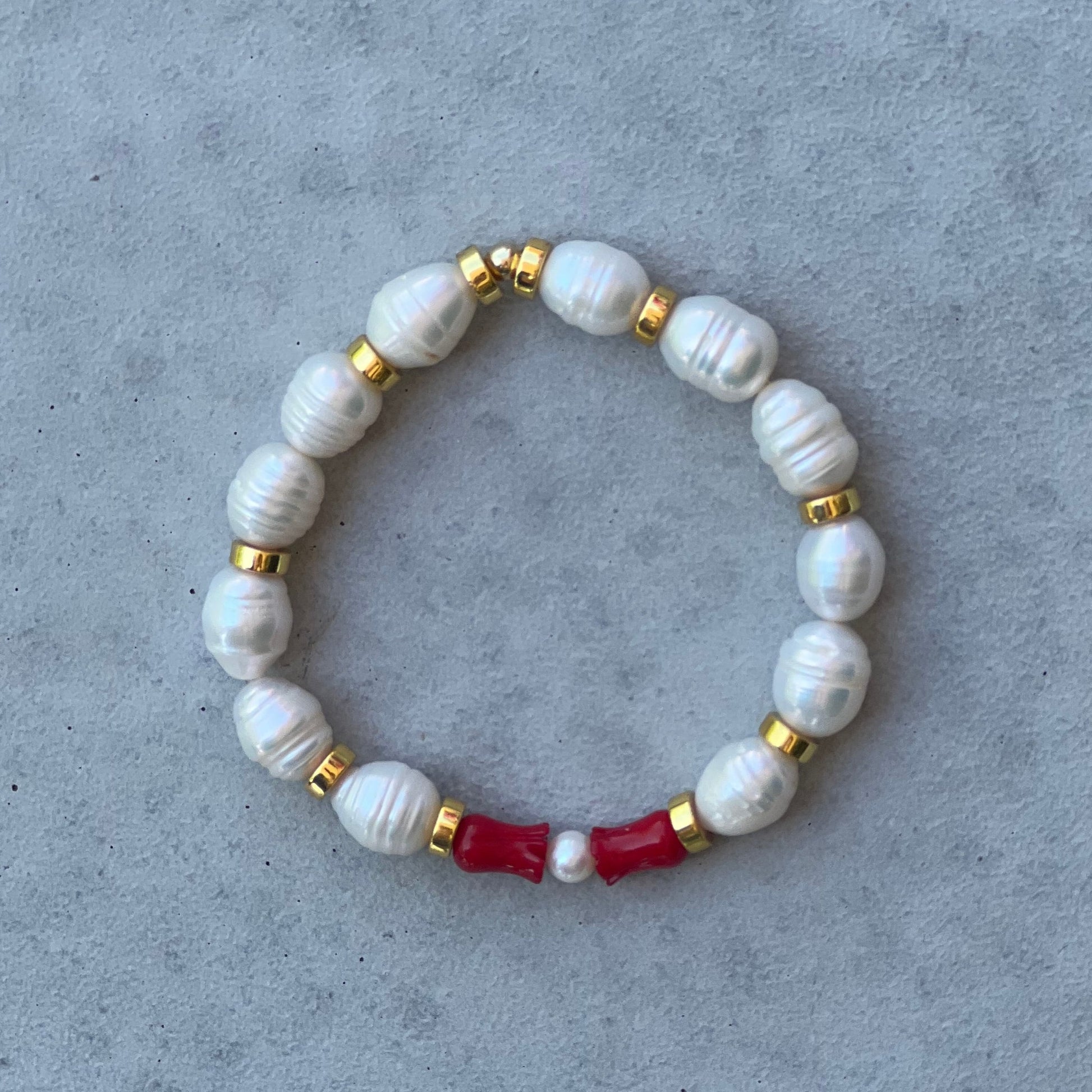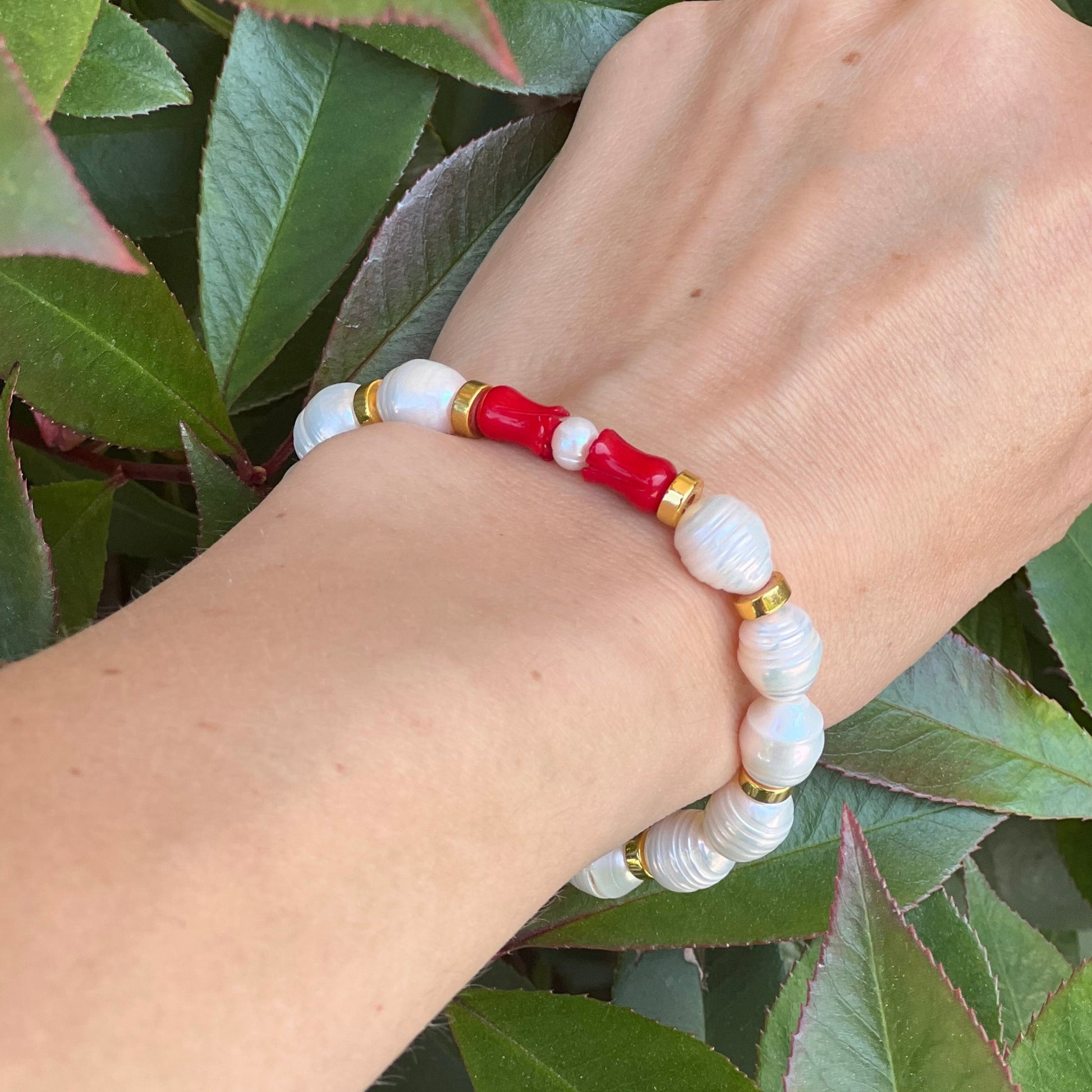 Această brățară unică este realizată manual cu perle de cultura, pietre de coral rosu și hematite aurii. Combinarea acestor elemente creează o bijuterie sofisticată și rafinată, cu o textură interesantă și o paletă de culori deosebite. Această brățară lucrată manual este o alegere excelentă pentru femeile care caută o bijuterie unică și elegantă, care să completeze cu stil ținutele lor preferate.