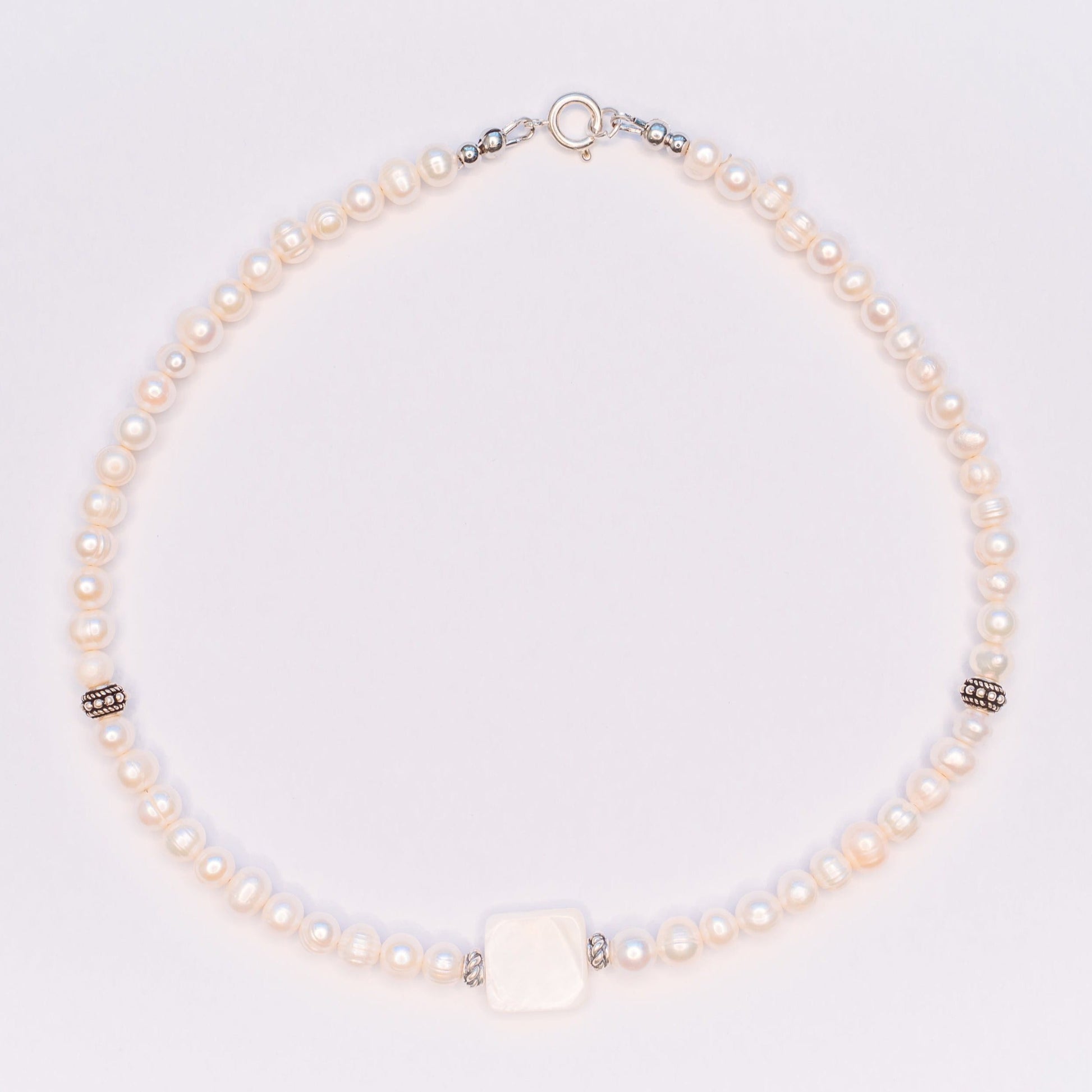 Acest colier lucrat manual este o bijuterie elegantă și rafinată, creată cu un șirag de perle de cultură și o perla de sidef. Designul său clasic și frumusețea naturală a perlelor adaugă o notă de eleganță și stil oricărei ținute. Este bijuteria perfectă pentru a completa un look sofisticat și poate fi purtată cu încredere la orice eveniment special.